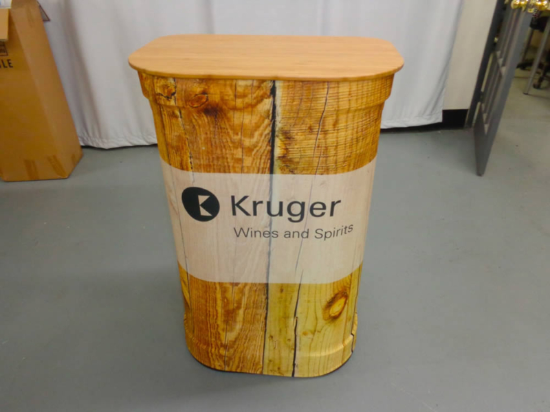 Transportez, installez, exposez. En quelques gestes, vous fixez le plateau bois, installez la jupe personnalisée, et disposez d’un point d’accueil professionnel et à votre image.