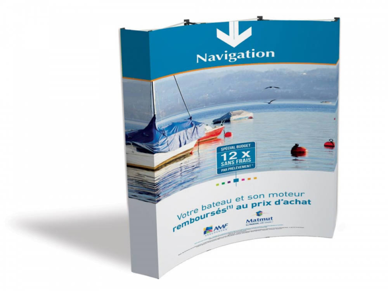 Bréard a eu le plaisir de réaliser un stand Matmut pour cette célèbre société d’assurance. Ce stand Matmut est un stand parapluie facile à transporter et léger grâce à sa structure en aluminium pliable. L’impression du visuel est faite en quadri avec une impression par sublimation directe sur un tissu normé antifeu m1 au sein de notre atelier de création. Une fois le stand déplié et monté, le visuel est parfaitement tendu par un système autobloquant et de velcro. Ce stand expo est parfait pour votre image de marque, il n’y a donc pas que la Matmut qui assure, Bréard communication aussi en matière de fabrication de stand parapluie.